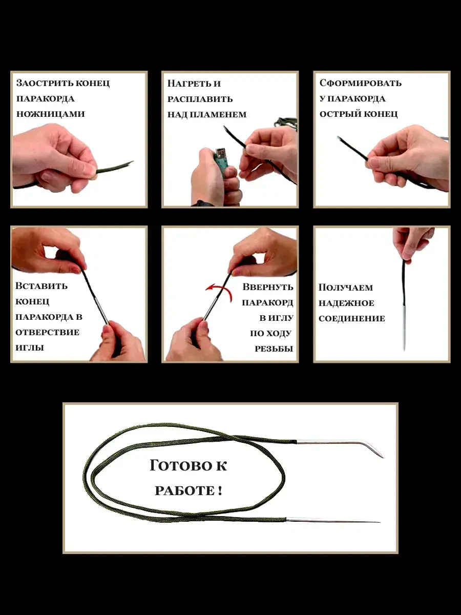 Иглы с внутренней резьбой используются для удобства плетения из паракорда и других нейлоновых шнуров изделий высокой плотности: браслетов и темляков, ремней и брелков, ошейников, различных оплеток. Игла с тупого конца имеет внутреннюю резьбу для закрепления паракорда. Предварительно паракорд слегка обжигается (расплавляется), формируется острый конец шнура, который сразу вкручивается в иглу. При остывании шнур приобретает на конце резьбу, чем обеспечивается прочное сцепление шнура с иглой.